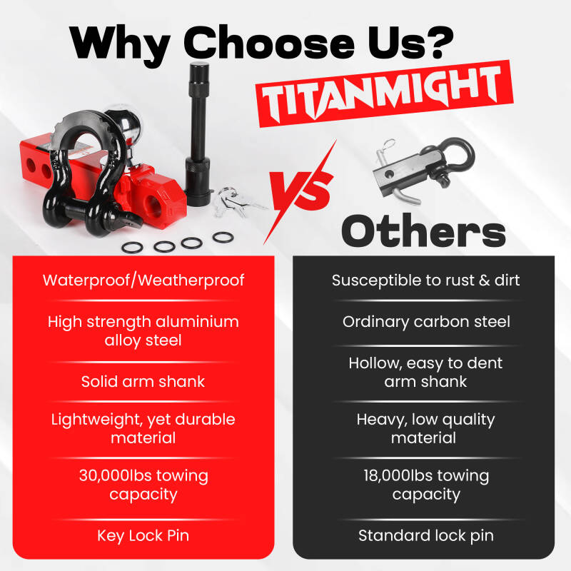 Upgrade your vehicle's towing capabilities with our TITANMIGHT heavy-duty trailer hitch. Designed as an all-in-one solution for secure and reliable hauling, it features a sturdy ball mount and a robust tow shackle. The ball mount allows for easy attachment of trailers, campers, or cargo carriers, while the tow shackle provides an additional connection point for extra stability and towing needs. Constructed from high-quality aluminium alloy steel, this trailer hitch offers superior strength and durability to handle even the toughest towing jobs. The arm shank is crafted with solid steel throughout unlike most other hollow hitches.